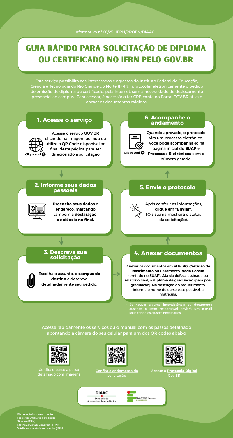 É importante informar que todos os certificados e diplomas emitidos pelo IFRN são digitais, com representação gráfica e validação eletrônica, não necessitando de impressão. A mudança está em conformidade com a Resolução 25/2021 (CONSUP/IFRN) e as Portarias 330/2018 e 554/2019554/2019, do Ministério da Educação (para saber mais detalhes sobre esse assunto, clique aqui).
