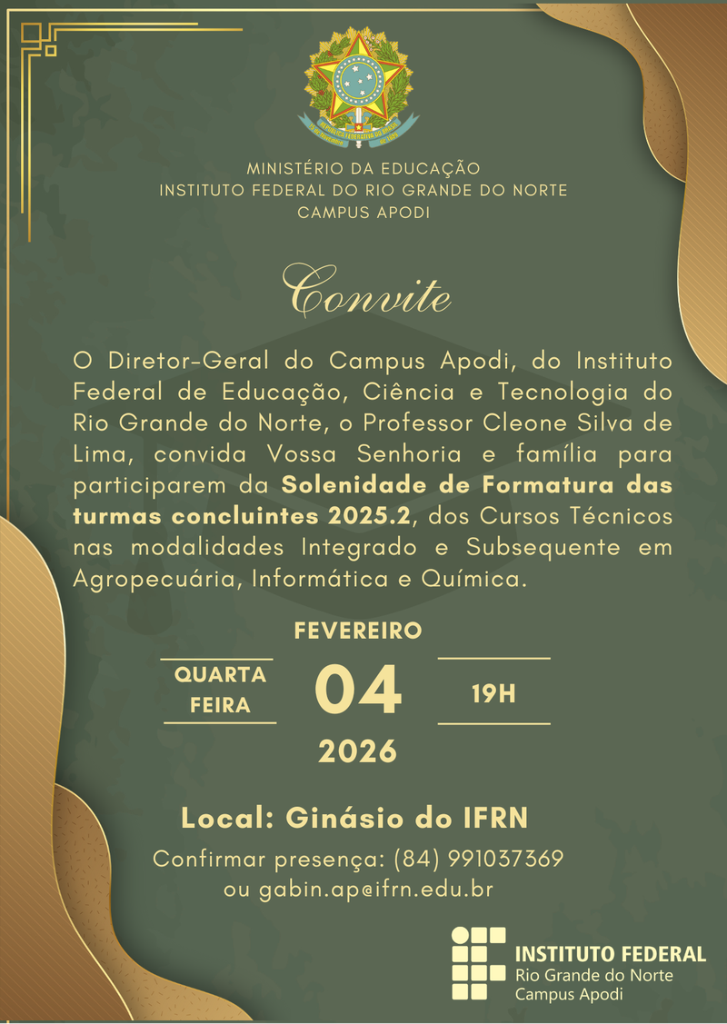 A Cerimônia, de caráter público, está confirmada para o dia 4 de fevereiro de 2026 (quarta-feira), às 19h, no Ginásio Poliesportivo do IFRN, em Apodi.