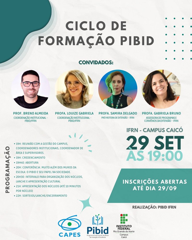 Na próxima semana o Campus Caicó sediará o CICLO DE FORMAÇÃO 2025.2, atividade integrante do Programa Institucional de Bolsa de Iniciação à Docência – PIBID.