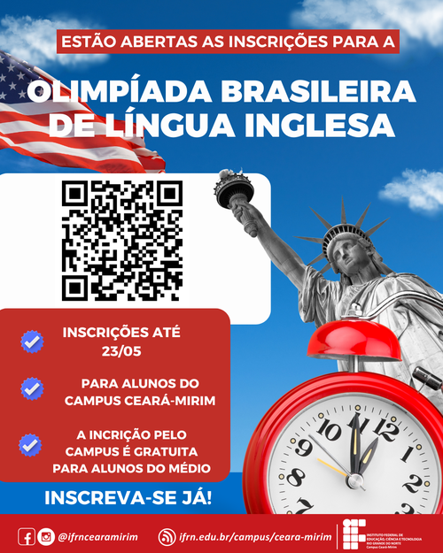 As inscrições para a Olimpíada Brasileira de Língua Inglesa (OBLI) estão abertas até o dia 23/05. Para alunos de ensino médio do Campus Ceará-Mirim, se forem inscritos pelo próprio campus, a inscrição é gratuita!
