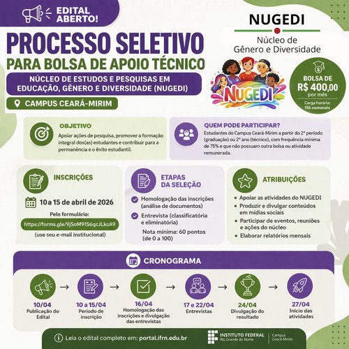 O Campus Ceará-Mirim do IFRN publicou edital para seleção de estudante bolsista que atuará no Núcleo de Estudos e Pesquisas em Educação, Gênero e Diversidade (NUGEDI).