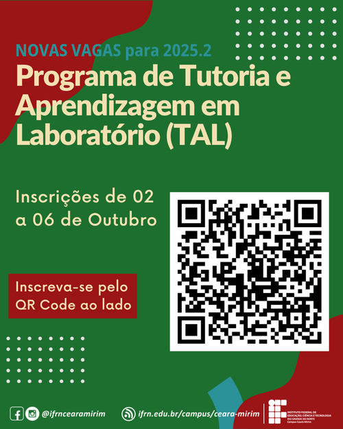 O IFRN Campus Ceará-Mirim publicou o Edital nº 30/2025 – DG/CM/RE/IFRN, referente à seleção de bolsistas e voluntários para o Programa de Tutoria e Aprendizagem em Laboratório (TAL).