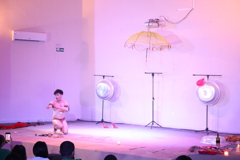 Com o tema “Corpos em resistência, memórias em movimento”, o encontro celebrou a força e a ancestralidade dos povos negros e quilombolas por meio das artes cênicas e das manifestações da cultura popular. A programação contou com o espetáculo “Axé Nzinga”, apresentado pelo artista potiguar Jonas Sales, que trouxe ao palco uma narrativa corporal inspirada na história da rainha africana Nzinga, símbolo de resistência à escravidão e à opressão colonial. Em cena, o performer apresenta parte de sua pesquisa sobre “Corponegritude”, conceito construído em sua tese de doutorado que aproxima técnicas das expressões populares de matrizes africanas por meio do corpo em movimento.