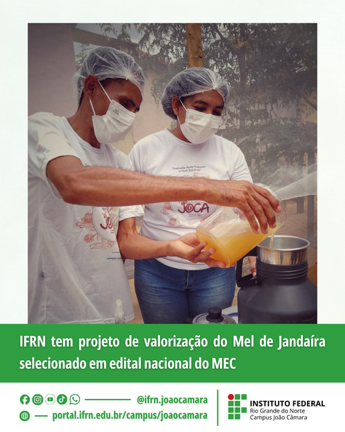 O projeto, intitulado “Estruturação de IG para o mel de Jandaíra como estratégia de desenvolvimento territorial”, de autoria da professora do Campus João Câmara do IFRN Liária Nunes da Silva, foi selecionado em 6º lugar no edital e conta com o apoio da Associação de Jovens Agroecologistas Amigos do Cabeço (JOCA); do Serviço Brasileiro de Apoio às Micro e Pequenas Empresas (SEBRAE/RN); e de colaboração técnica da Universidade Federal do Rio Grande do Norte (UFRN).