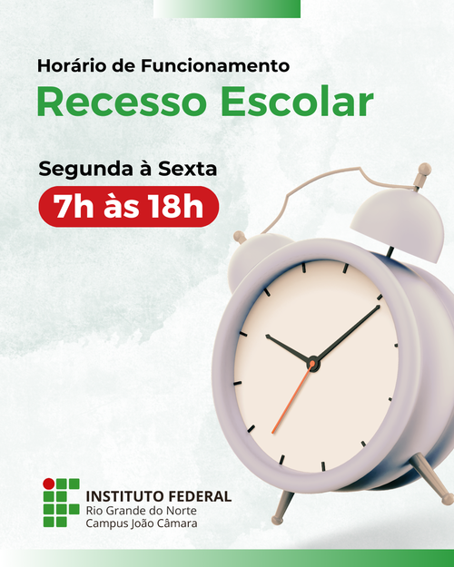 A Direção-Geral do Campus João Câmara do IFRN, por meio da Portaria Nº 42/2026-DG/JC/RE/IFRN, informa à comunidade acadêmica que, durante o período de recesso escolar e férias docentes, compreendido entre 19 de fevereiro e 11 de março de 2026, o horário de funcionamento desta unidade de ensino será das 07h às 18h, de segunda à sexta-feira.