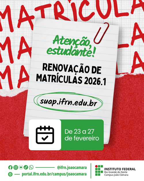 A Secretaria Acadêmica do Campus João Câmara do IFRN informa aos estudantes que a Renovação de Matrículas para o semestre 2026.1 acontece no período de 23 a 27 de fevereiro por meio do Suap.