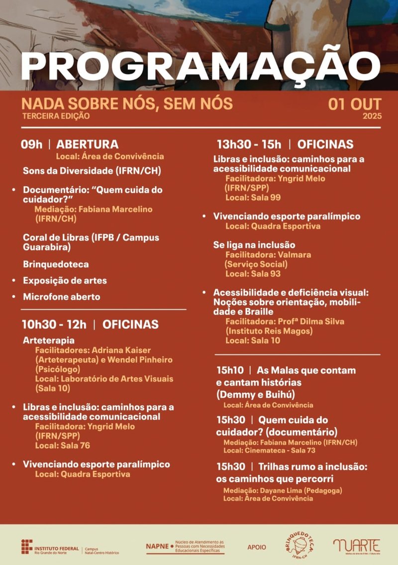 Hoje (01.10) pela manhã, no espaço de convivência do IFRN Campus Natal Centro Histórico teve início a terceira edição do evento Nada sobre nós, sem nós, promovido pelo Núcleo de Atendimento às Pessoas com Necessidades Educacionais Específicas (NAPNE), em alusão ao Dia Nacional de Luta da Pessoa com Deficiência.