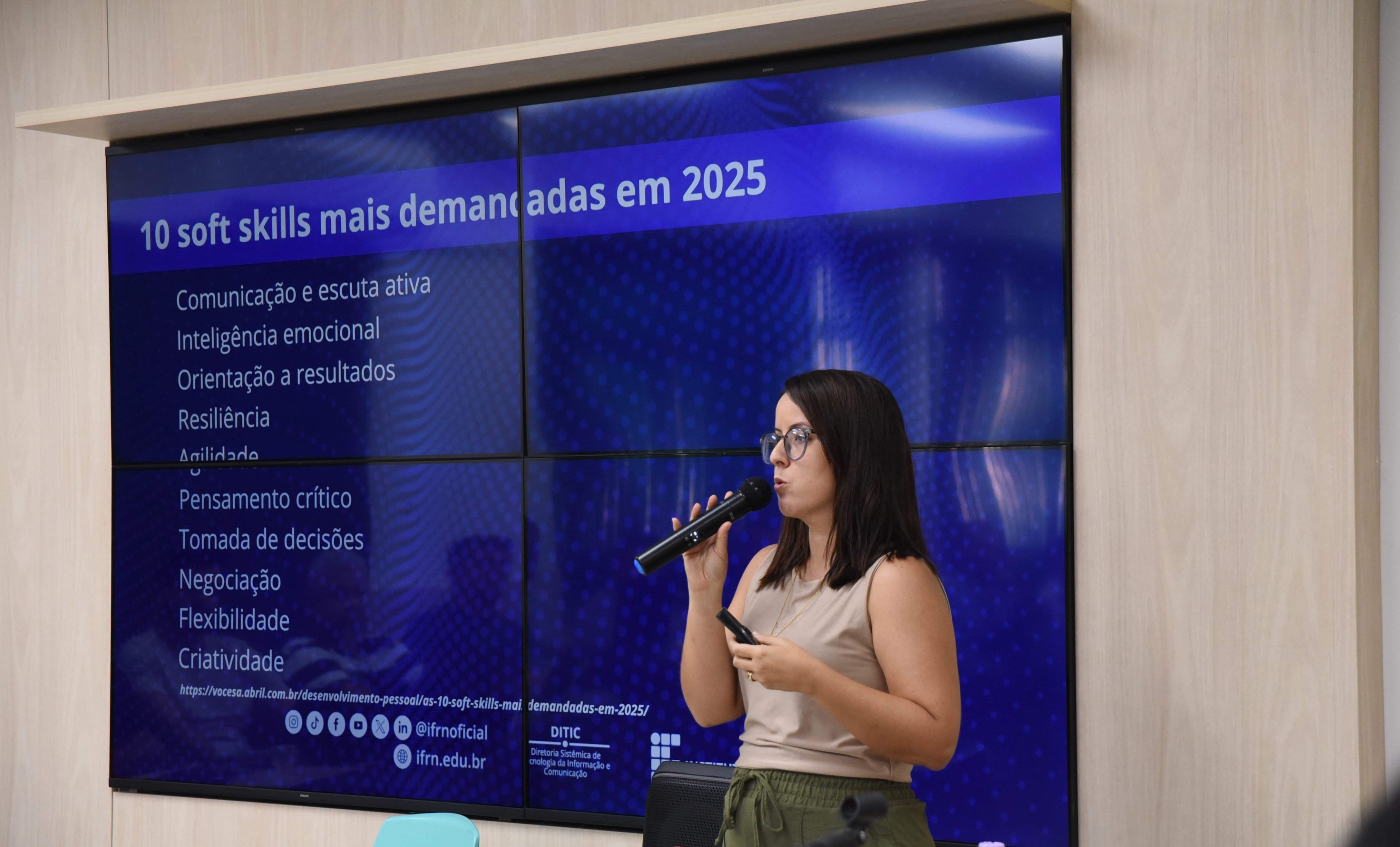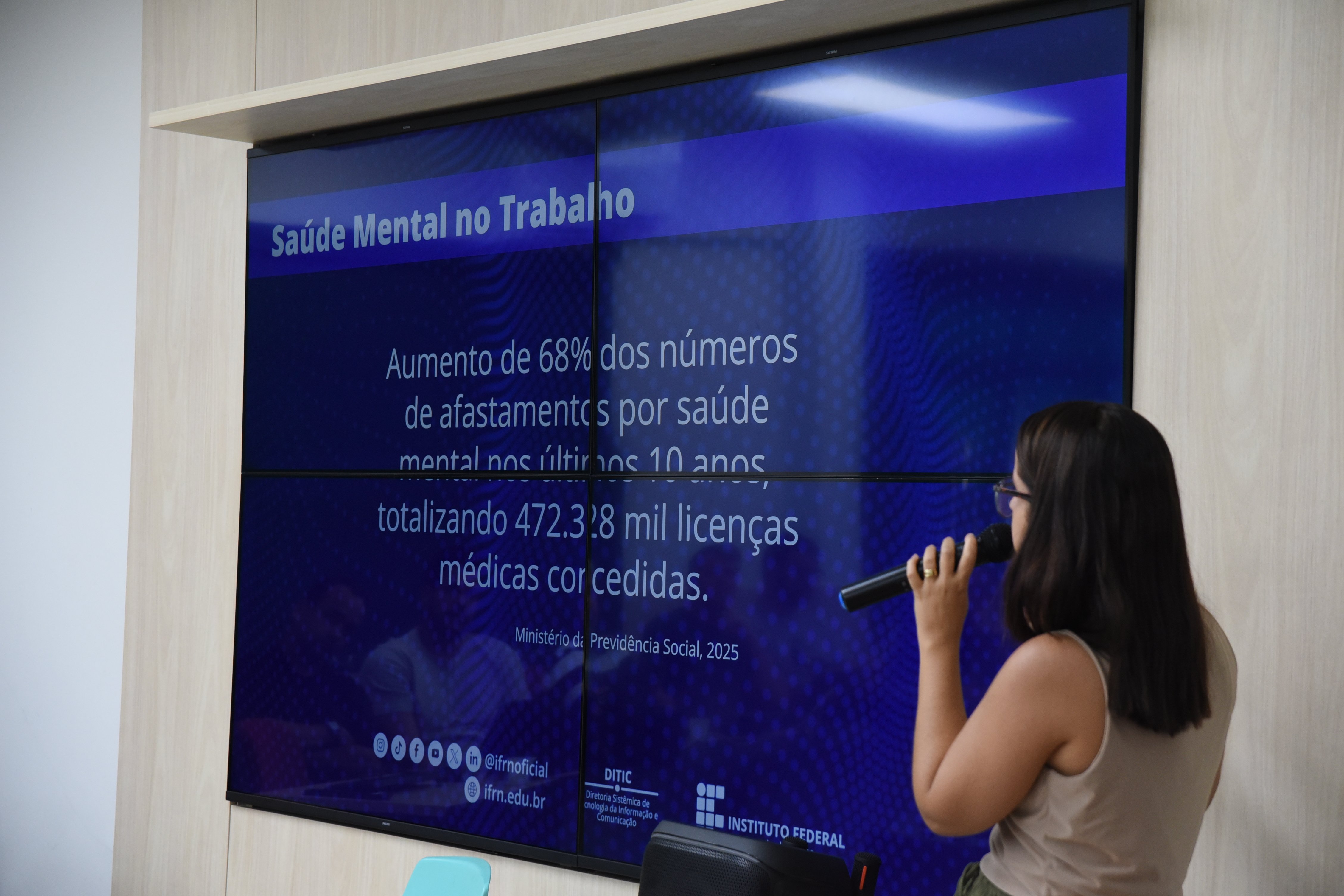 A programação do primeiro dia contou com a participação da psicóloga organizacional da UFRN, Julliana da Costa Macêdo Paiva, que ministrou a palestra “Liderar para transformar: estratégias de gestão e engajamento em equipes”, onde refletiu sobre os impactos da hiperconectividade na vida profissional e pessoal, destacando que a conexão permanente ao trabalho afeta a saúde mental e as relações sociais.