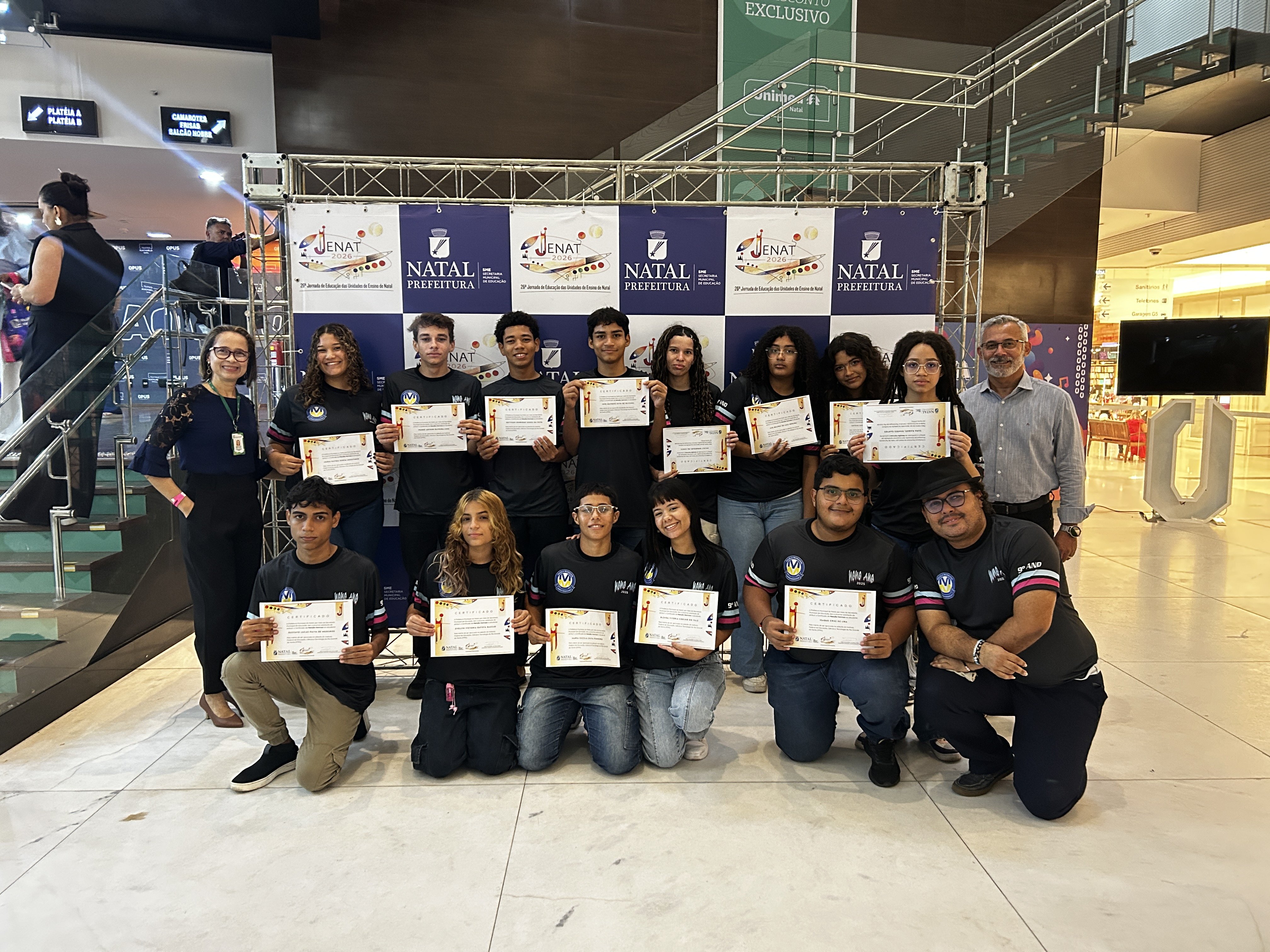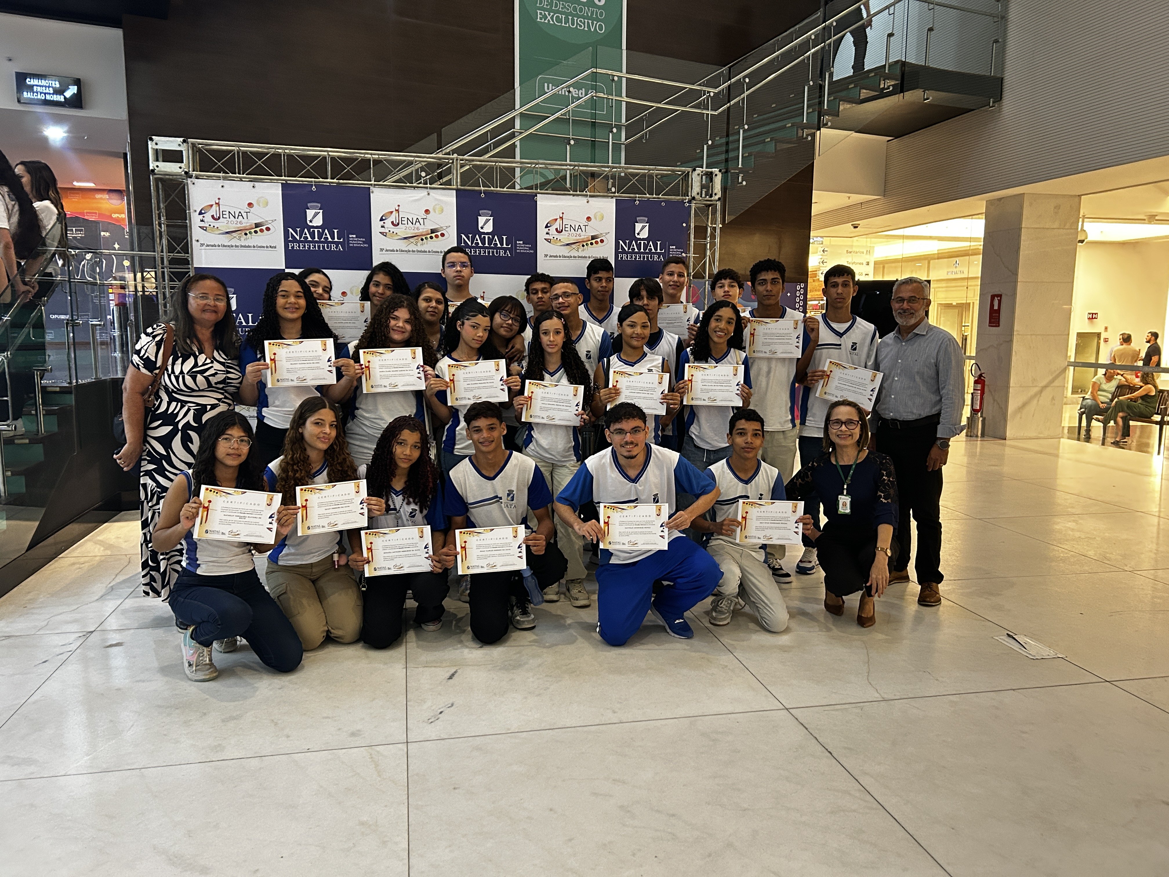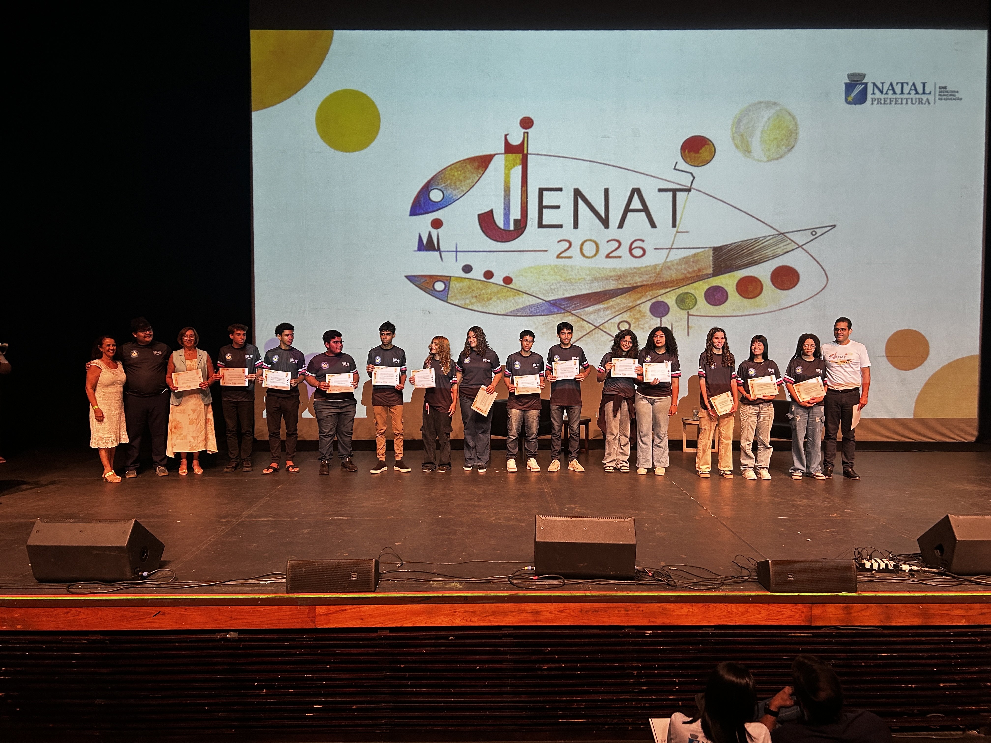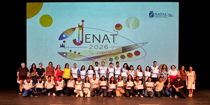 O Instituto Federal do Rio Grande do Norte (IFRN) participou, no dia 4 de fevereiro, da 26ª edição da Jornada de Educação das Unidades de Ensino de Natal (Jenat 2026), evento promovido pela Secretaria Municipal de Educação de Natal (SME) e realizado no Teatro Riachuelo, em Natal. Durante a programação, a SME homenageou estudantes da rede municipal aprovados no Exame de Seleção 2026 do IFRN, com a entrega de certificados de menção honrosa aos futuros alunos e alunas da Instituição.
