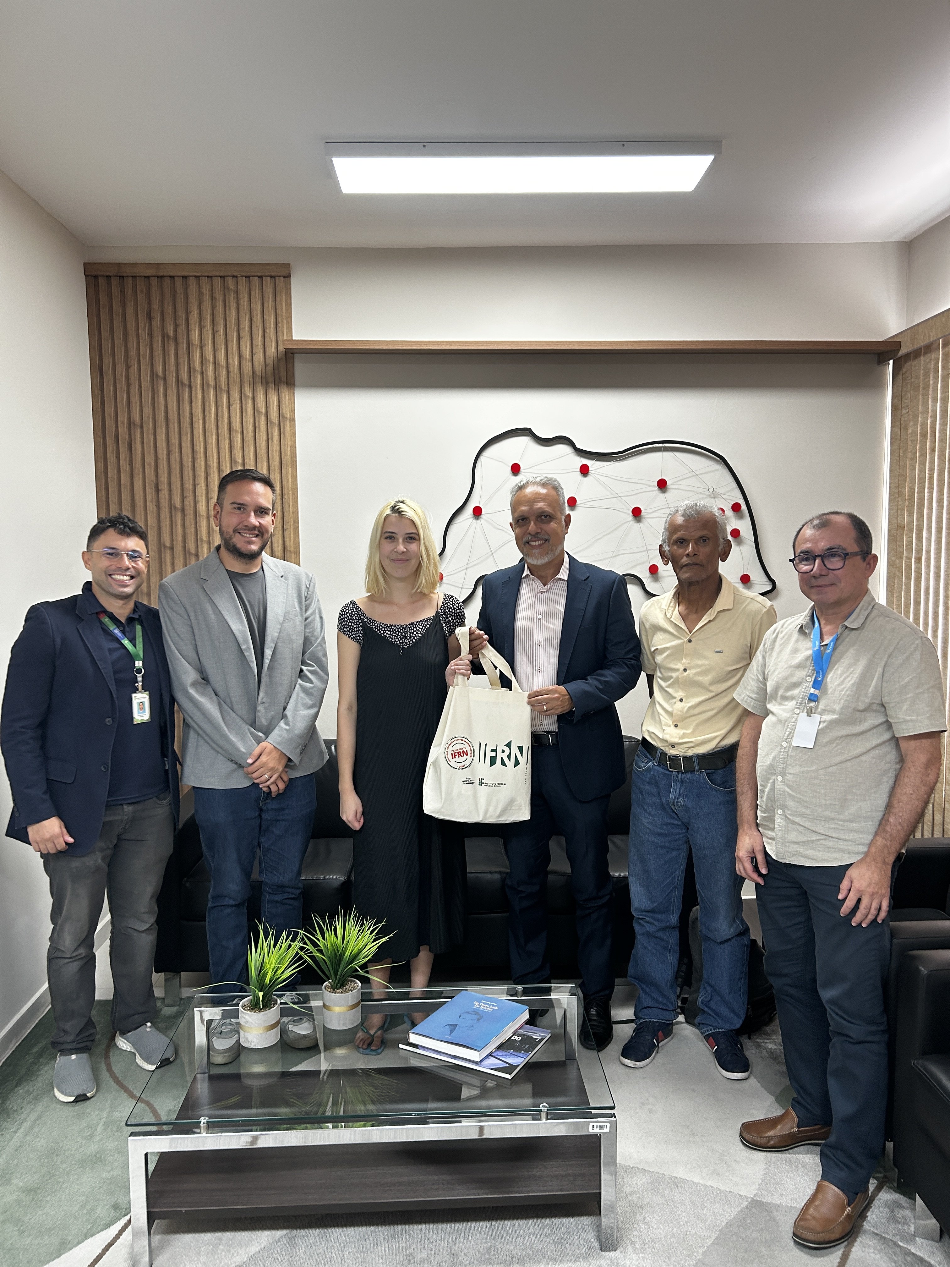 Participaram da reunião o diretor de Internacionalização, Bruno Rafael, o assessor de políticas linguísticas, Felipe Morais, o professor Antonio Custódio e o gerente administrativo e financeiro da Fundação de Apoio ao IFRN (Funcern), Francisco Pontes. A agenda institucional marcou o início das atividades da assistente no Brasil, onde permanecerá por um período de dez meses.