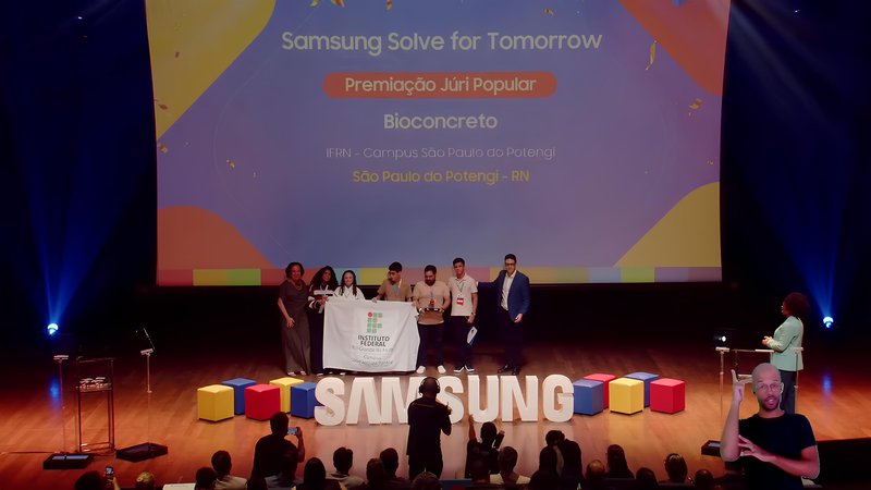 O projeto “Bioconcreto: construindo futuros renováveis”, desenvolvido no Campus São Paulo do Potengi (CSPP), conquistou o Prêmio de Júri Popular da 12ª edição do Solve for Tomorrow Brasil, programa global da Samsung que estimula iniciativas científicas e tecnológicas criadas por estudantes da rede pública. A cerimônia de premiação ocorreu em 2 de dezembro, em São Paulo, reunindo as dez equipes finalistas do país.