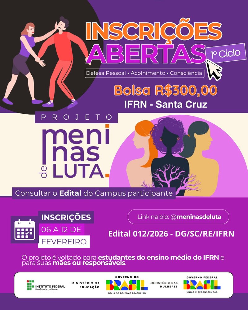 O Instituto Federal de Educação, Ciência e Tecnologia do Rio Grande do Norte (IFRN) – Campus Santa Cruz torna público o Edital nº *12/2026*, que trata do processo seletivo para ingresso no Projeto Meninas de Luta – 2026/1. O projeto tem como objetivo contribuir para a prevenção e o enfrentamento da violência de gênero, por meio de aulas de defesa pessoal e ações socioeducativas e psicossociais, com abordagem político-feminista e antirracista.