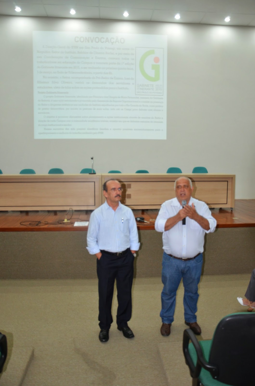 Após tomar café com os servidores, o Reitor abriu os trabalhos do Gabinete Itinerante numa fala rápida para técnicos e docentes, na sala de videoconferência. Na sequência, acompanhado pelo Diretor Geral do Campus, Ednaldo Pereira, o Professor Belchior foi recepcionado, no auditório, pelos estudantes dos cursos Integrado e Subsequente do IFRN - São Paulo do Potengi. Tão logo encerrou sua fala, onde falou sobre incentivos, desafios e persistência em busca do sonho, o Reitor respondeu perguntas do alunado. Questionamentos, dúvidas, solicitações e queixas foram ouvidos e encaminhados.