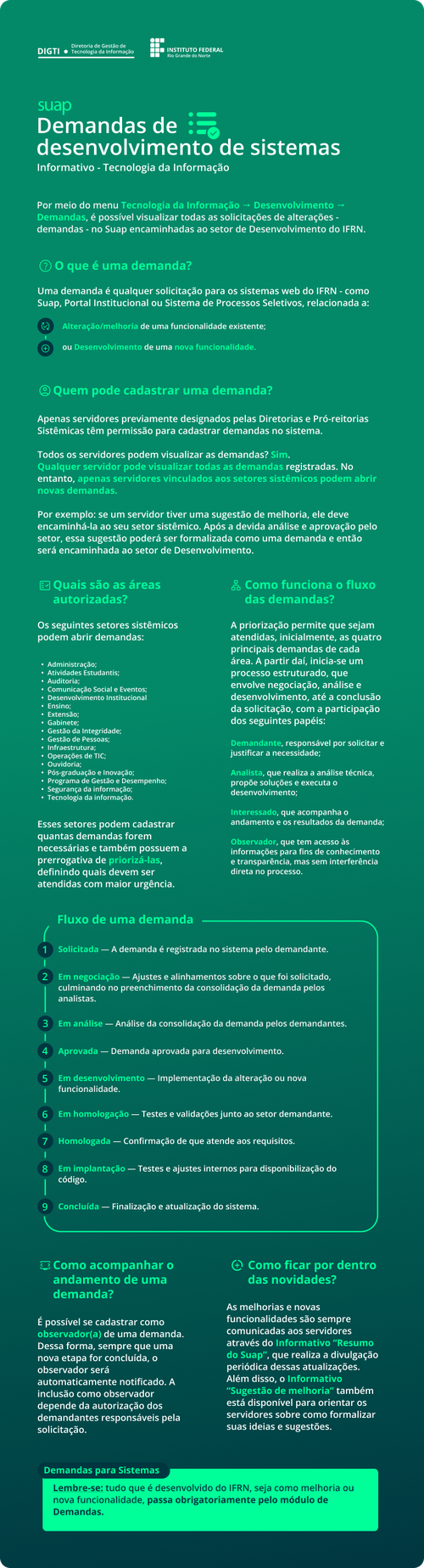 Lembre-se: tudo que é desenvolvido do IFRN, seja como melhoria ou nova funcionalidade, passa obrigatoriamente pelo módulo de Demandas.