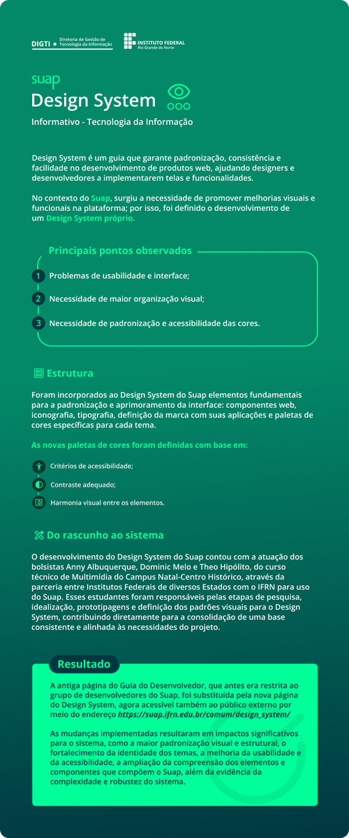 A antiga página do Guia do Desenvolvedor, que antes era restrita ao grupo de desenvolvedores do Suap, foi substituída pela nova página do Design System, agora acessível também ao público externo por meio do endereço https://suap.ifrn.edu.br/comum/design_system/.